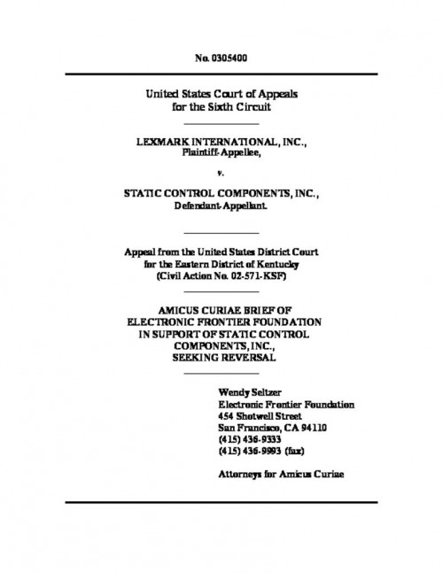 Document | July 2, 2003 EFF amicus brief in support of Static Control Components, Inc. Read more about EFF amicus brief in support of Static Control Components, Inc.