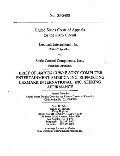Document | July 30, 2003 Brief of Amicus Curiae of Sony Computer Entertainment America Inc. in Support of Lexmark Read more about Brief of Amicus Curiae of Sony Computer Entertainment America Inc. in Support of Lexmark