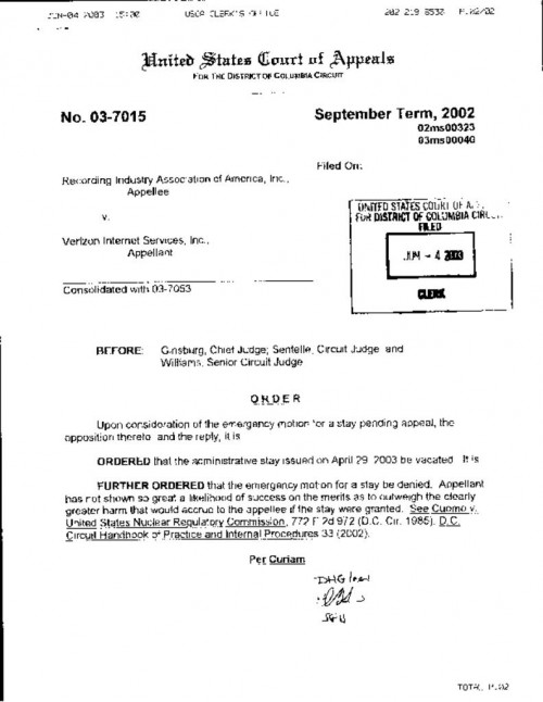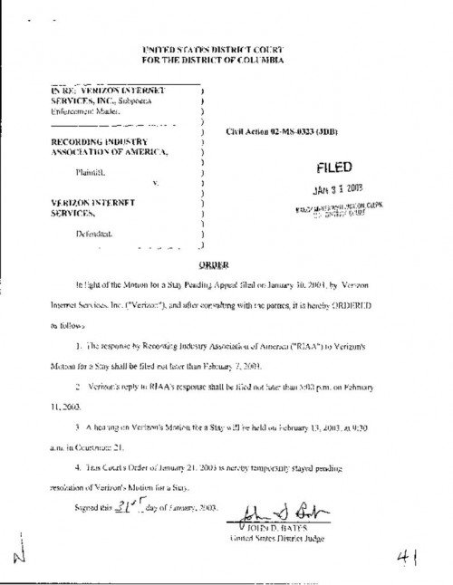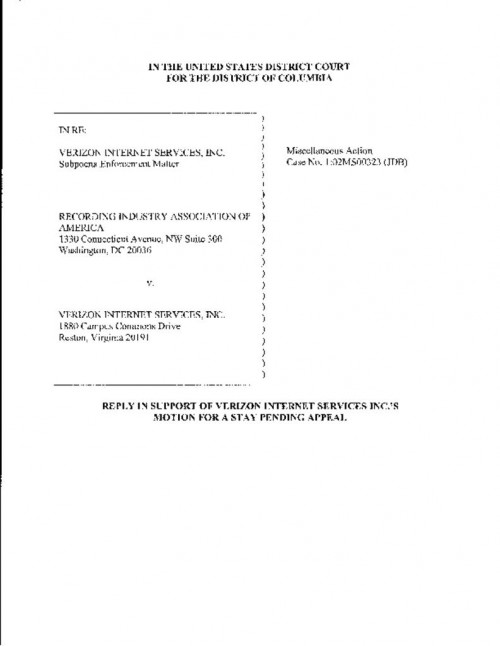 By vacating the stay, the order requires Verizon to turn over identifying information in response to the RIAA subpoena