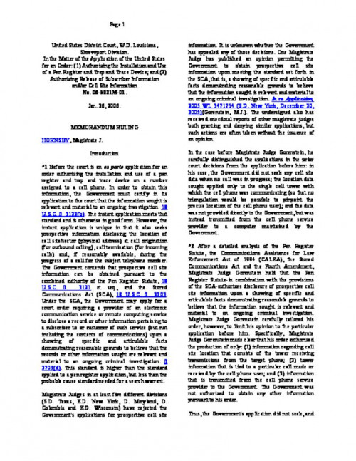 Document | January 26, 2006 Court Order Granting Government Request for Cell Phone Tracking Read more about Court Order Granting Government Request for Cell Phone Tracking