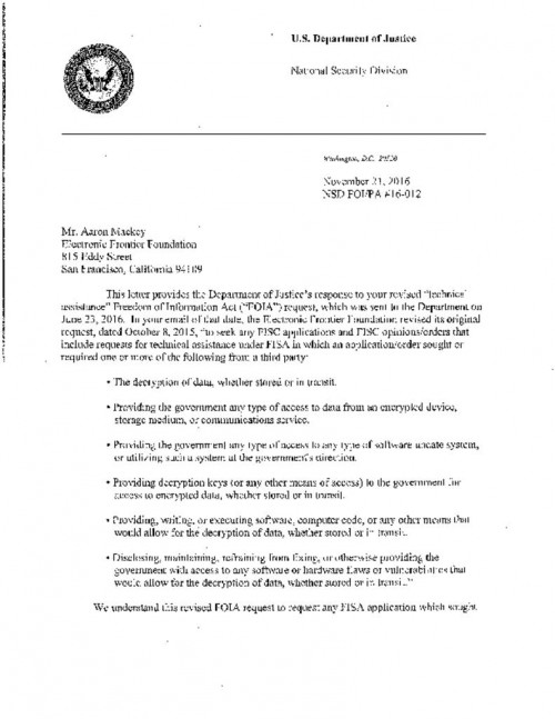 In addition to this request, EFF also filed suit to obtain any order from the FISC requiring third parties—like Apple or Google—to provide technical assistance to carry out surveillance. EFF filed its request amid increasing government pressure on technology companies to provide access to customers’ devices and encrypted communications for investigations. Although the FBI has sought orders from public federal courts to create a backdoor to an iPhone, it is unclear to what extent the government has sought or obtained similar orders from the FISC. EFF's lawsuit seeks access to those orders.