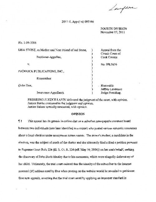 Outcome: On November 17, 2011, the Illinois Court of Appeals reversed the lower court's opinion, holding that the First Amendment right to anonymous speech barred efforts to unmask an online speaker in support of a defamation claim where that underlying statement was not actionable as a matter of law. From the Court's conclusion: