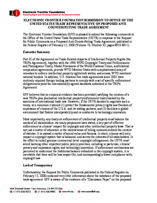 - Provisions: It would require signatory countries to enact new IP enforcement measures that would call for restrictive rules for the Internet that raise significant potential concerns for users’ free speech, privacy, ability to innovate, and due process rights.