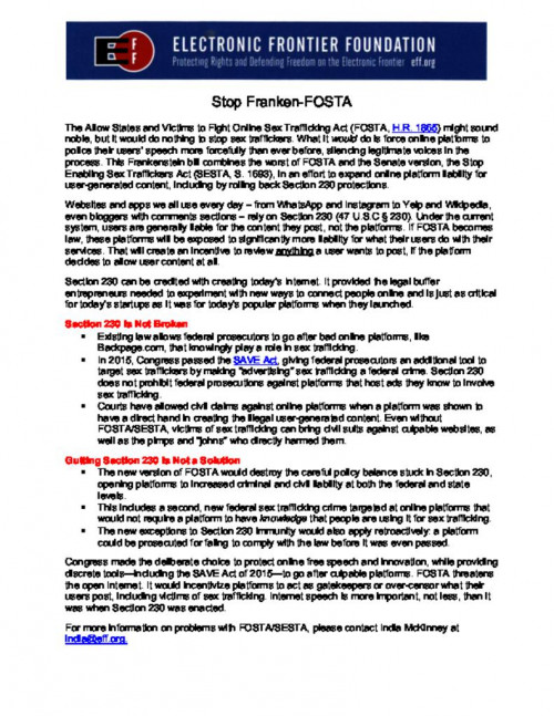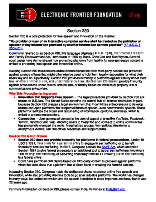 That’s why the U.S. Congress passed a law, Section 230 (originally part of the Communications Decency Act), that protects Americans’ freedom of expression online by protecting the intermediaries we all rely on. It states: