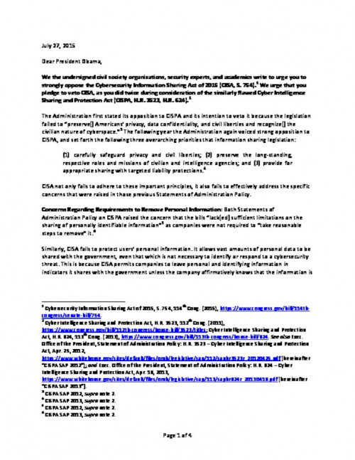 Every year a host of cybersecurity bills are introduced in Congress. In 2014, the Cyber Intelligence Sharing and Protection Act (CISPA) was introduced in the US House, and the Cybersecurity Information Sharing Act (CISA) was introduced in the Senate. Both bills are privacy invasive bills that grant companies broad legal immunity to share more information with the government and private companies. Click here to read our FAQ on CISPA 2.0.