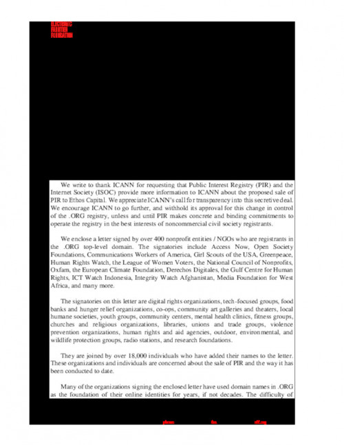 - The 2013 agreement that governs registrars' contractual relationship with ICANN, along with new agreements between ICANN and registries, go further than the previous versions in requiring them to take steps against those who "abuse" domain names. This new contractual language threatens to put registrars, registries, and ICANN itself in the role of regulating speech on the Internet, without due process or accountability. Entertainment industry lobbyists, pharmaceutical interests, law enforcement, and the US Trade Representative have seized on these provisions to demand that registrars suspend domain names based on accusations that the websites they point to contain illegal or other “bad” content—without a court order or meaningful legal process. Such a policy would resemble the one proposed and thoroughly rejected by the U.S. Congress in the infamous SOPA/PIPA bills.