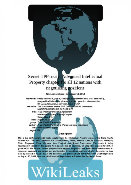 The twelve nations that negotiated the TPP were the U.S., Japan, Australia, Peru, Malaysia, Vietnam, New Zealand, Chile, Singapore, Canada, Mexico, and Brunei Darussalam. The TPP contained a chapter on intellectual property covering copyright, trademarks, and patents. The official release of the final TPP text confirmed what we had long feared: that U.S. negotiators pushed for the adoption of copyright measures far more restrictive than currently required by international treaties, including the controversial Anti-Counterfeiting Trade Agreement (ACTA).