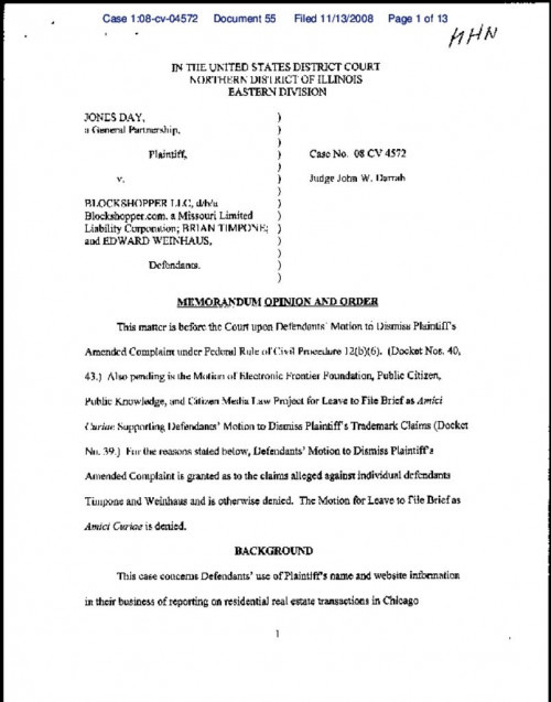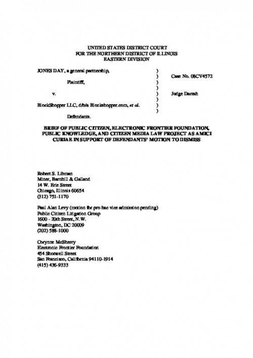 The firm of Jones Day filed the lawsuit against the real estate news site Blockshopper.com alleging that using its trademark "Jones Day" to refer to the firm in a headline and linking to the Jones Day website could lead to confusion over the sponsorship of the site. In its amicus brief EFF and Public Citizen argue that these routine references to Jones Day are well-established fair uses of a trademark and clearly protected by the First Amendment.
