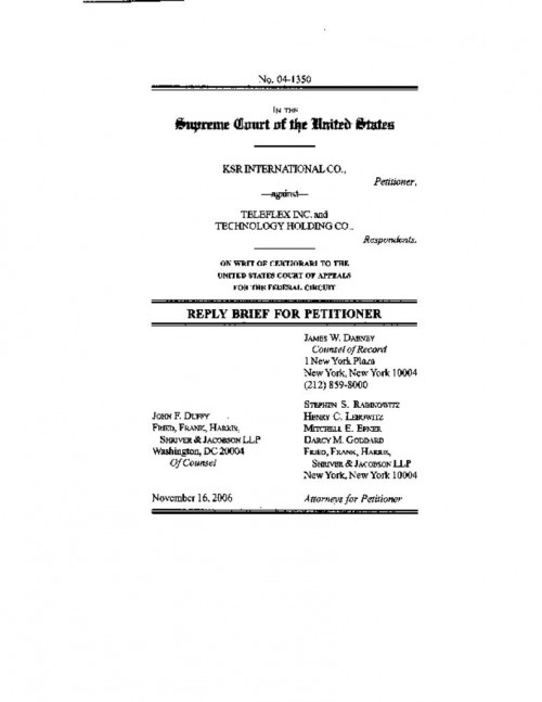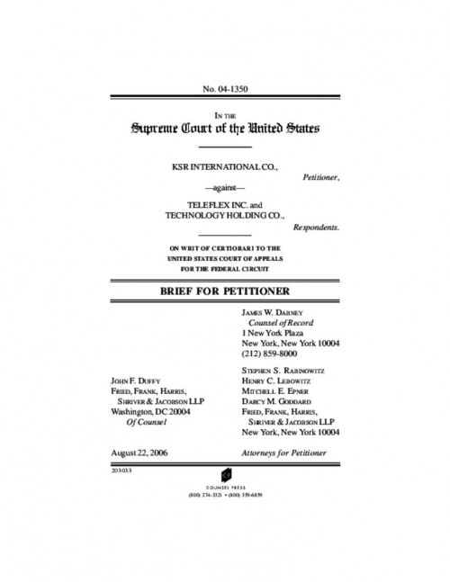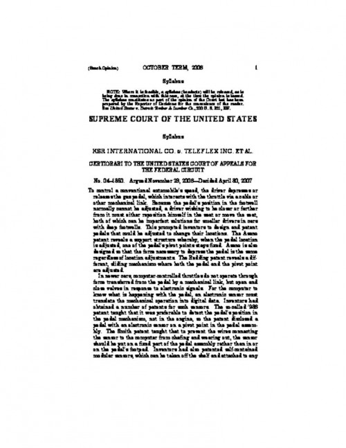 Teleflex Inc. sued the defendant KSR International, claiming that one of KSR's products infringed its patent on connecting an adjustable vehicle control pedal to an electronic throttle control. KSR argued that merely combining these two elements was obvious and therefore not patentable. KSR won at the district court level only to have the opinion overturned by the Court of Appeals for the Federal Circuit in January 2005.