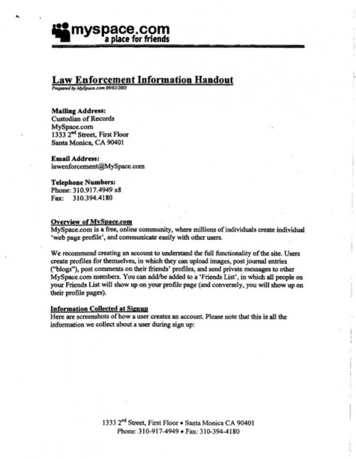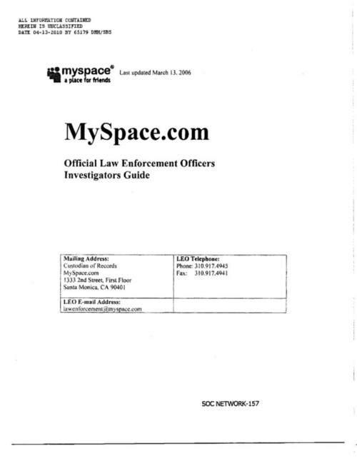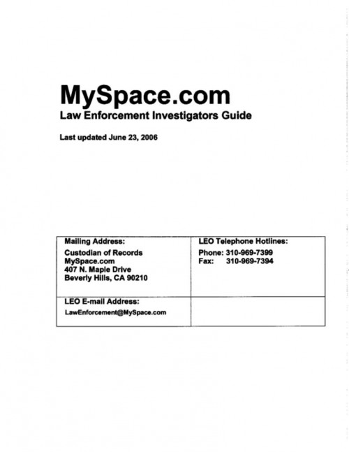 Document | January 20, 2011 MySpace June 2006 Law Enforcement Guide Read more about MySpace June 2006 Law Enforcement Guide