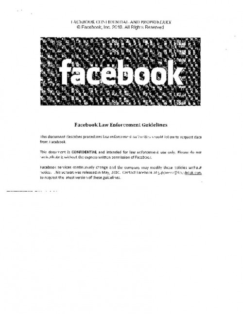 Document | January 20, 2011 Facebook 2010 Law Enforcement Guidelines* * The most recent version of Facebook's Law Enforcement Guidelines is available here: https://www.facebook.com/safety/groups/law/guidelines/ Read more about Facebook 2010 Law Enforcement Guidelines*
