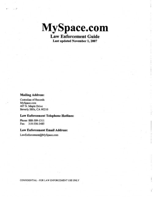 Document | January 20, 2011 MySpace 2007 Law Enforcement Guide Read more about MySpace 2007 Law Enforcement Guide