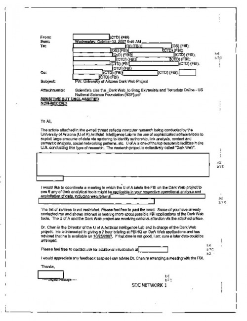 Document | October 12, 2010 FBI Dark Web Emails FBI emails reveal the FBI’s interest in the University of Arizona’s <a href="http://ai.arizona.edu/researc... Web Project</a>.... Read more about FBI Dark Web Emails