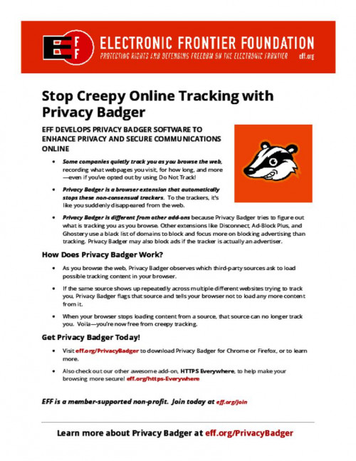 Privacy Badger 1.0 – New Ways to Stop Sneaky Trackers EFF is excited to announce that today we are releasing version 1.0 of Privacy Badger for Chrome and Firefox. Privacy Badger is a browser extension that automatically blocks hidden trackers that would otherwise spy on your browsing habits...