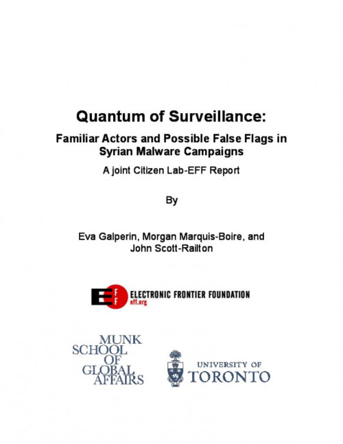 Citizen Lab security researchers Morgan Marquis-Boire and John Scott-Railton and EFF Global Policy Analyst Eva Galperin today published their latest technical paper, “Quantum of Surveillance: Familiar Actors and Possible False Flags in Syrian Malware Campaigns.” The report outlines how pro-...