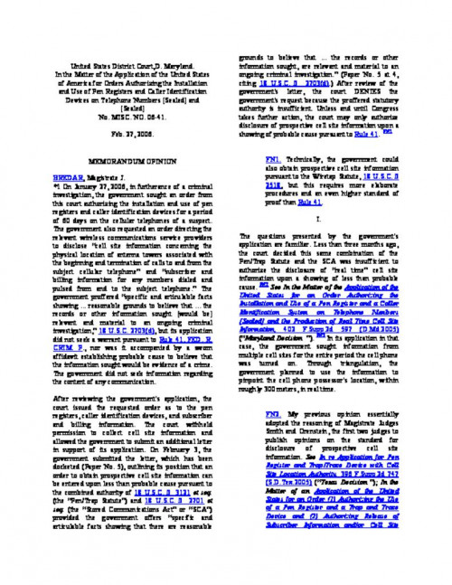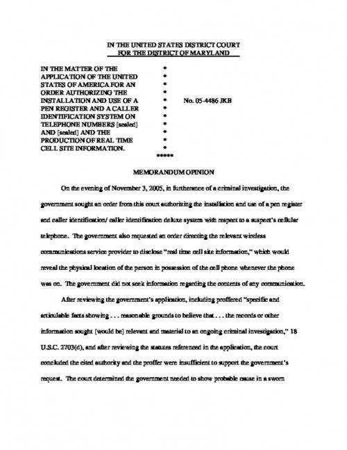 Document | November 28, 2005 Court Order Explaining Denial of Request for Cell Phone Tracking without Probable Cause Read more about Court Order Explaining Denial of Request for Cell Phone Tracking without Probable Cause