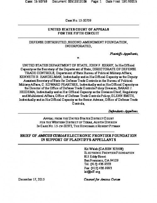 EFF filed an amicus brief in this case, arguing that the government cannot require Americans to go through an export licensing scheme prior to posting and sharing 3-D printer design files online, because publishing technical information is a form of speech protected by the First Amendment.